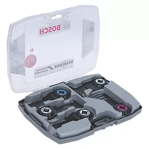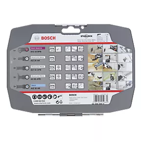 Starlock multi-tool blade set for electrical and drywall applications. Features Starlock pickup system for quick blade change in around 3 seconds without touching the blade. 3-dimensional tight fit provides maximum power transfer between machine and accessory. Suitable for softwood, hardwood, plasterboard, chipboard, sandwich materials, soft plastic, wood with nails, screws, profiles made of non-ferrous metal, hardened and unhardened metal and abrasive material. Includes blades for deep and fast cuts, wide cuts and plunge cuts. Supplied with storage case.