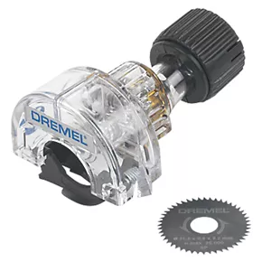 Transforms a Dremel tool into a precision circular saw for fine, clear and straight cuts in all sorts of wood. Angled neckline provides straight, perpendicular cuts for accuracy. Clear housing provides visibility of workpiece. Perfect for laminate and wood flooring or thin wood plates. The safety guard and lower guard make it safe to use the circular saw blade. Maximum safety is ensured by the guard retracting when not in use to prevent any risk to the user or workpiece. The guide allows straight cuts. Quick connect attaches a Dremel tool in seconds. Easier to use than a hand saw, more precise than a jigsaw and fits in tighter spaces than a circular saw. 31.8mm rip/cross-cut wheel mounts directly to the mini saw attachment without the need of a mandrel.