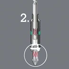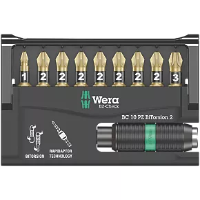 Pocket-sized, BiTorsion Bit-Check with Rapidaptor for insertion into the power screwdriver or for use in the chuck of an electric drill. Designed to prevent premature wear and extend service life due to precision hardening process. The BiTorsion zone absorbs peak stress loads. The holder, with quick-release chuck, offers press-in auto-lock and rapid one-handed bit changes for insert and power bits. The holder spin sleeve allows steady screwdriving. Colour coded for easy bit selection. Supplied with case.