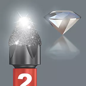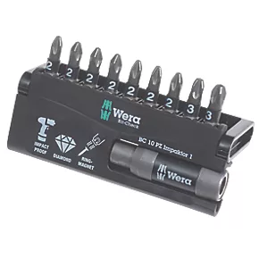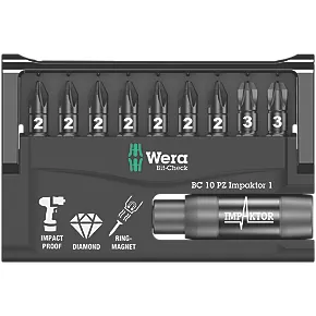 Impaktor bit set contains the premium TriTorsion Bit Holder with optional Ringmagnet function to hold screws up to 10″ long. Also contains Impaktor Diamond anti cam-out screwdriver Pozidriv bits, complemented by additional sizes from the high quality Wera bit range. Stored in a slim, compact, and easy open case for tool security and easy bit selection. Specifically designed for cordless impact drivers, these bits are suitable for heavy duty work. Diamond-coated for anti cam-out. The TriTorsion system means that together the bit and holder have 3 torsion zones to absorb the stresses applied by constant use in heavy duty impact drivers. Due to the precision hardening processes, the life of the screwdriver bits are dramatically increased.
